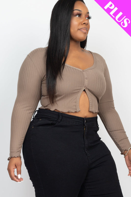 Plus Size Ribbed Button Front Split Long Sleeve Top (CAPELLA)