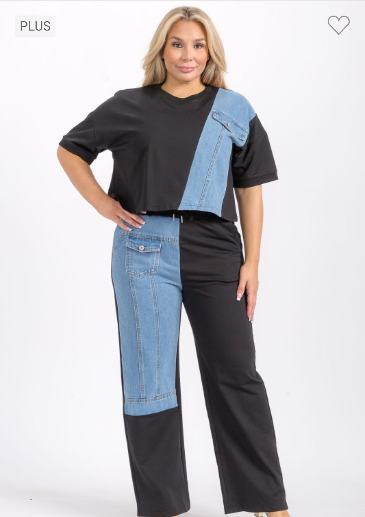 This plus size two-piece features a relaxed black tee with a unique denim panel across the shoulder and chest, perfectly paired with matching black pants accented with a denim insert on one leg. The soft stretch fabric ensures comfort while the denim detailing adds a trendy, streetwear-inspired vibe.