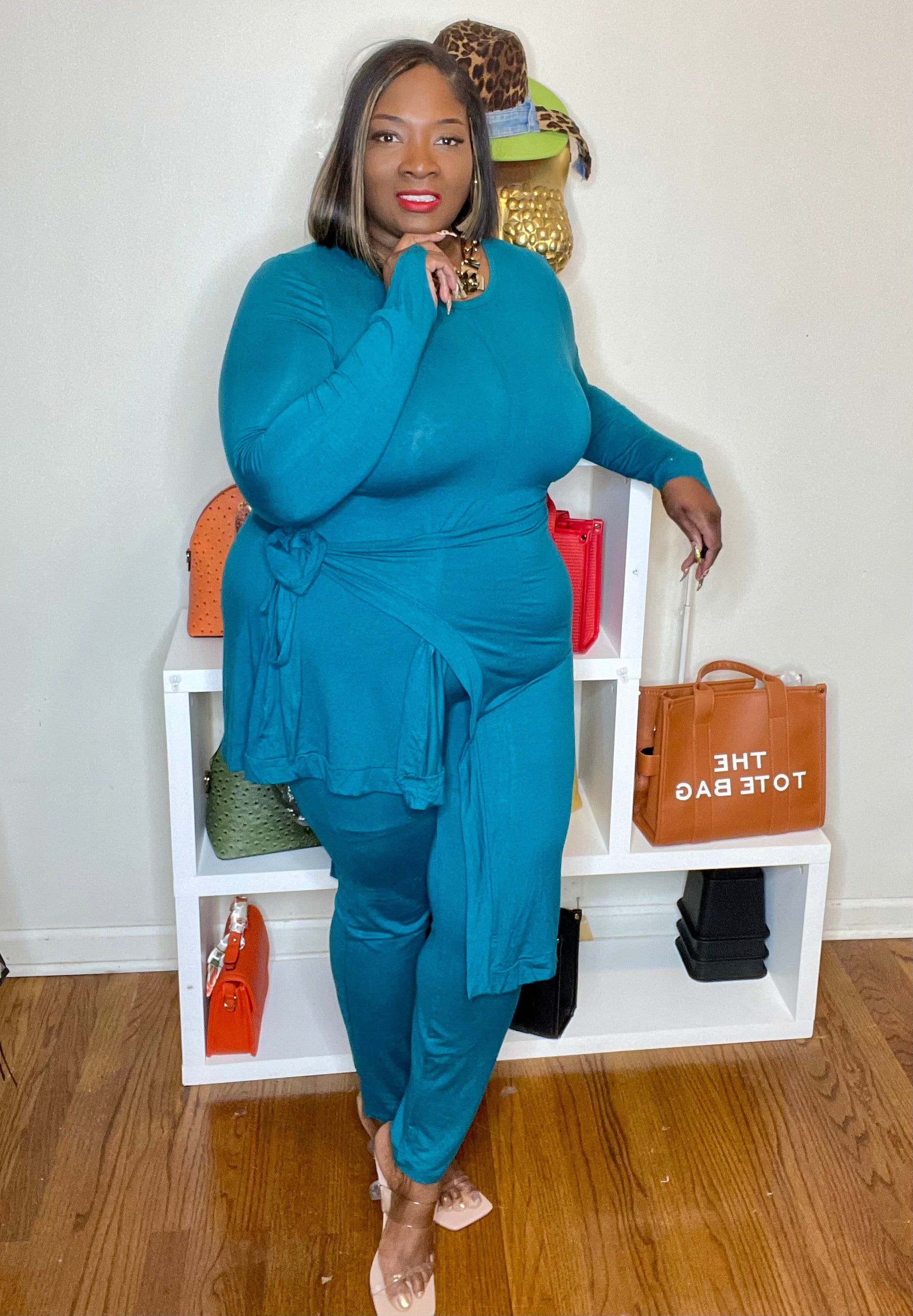 This stunning two-piece ensemble features a rich teal color that flatters every skin tone and a soft, stretchy fabric that hugs your curves in all the right places. The long-sleeve top is designed with a modern asymmetrical front slit and tie detail, adding a touch of drama and movement to your look. Paired with matching high-stretch fitted leggings, this set creates a sleek, confident silhouette from top to bottom.