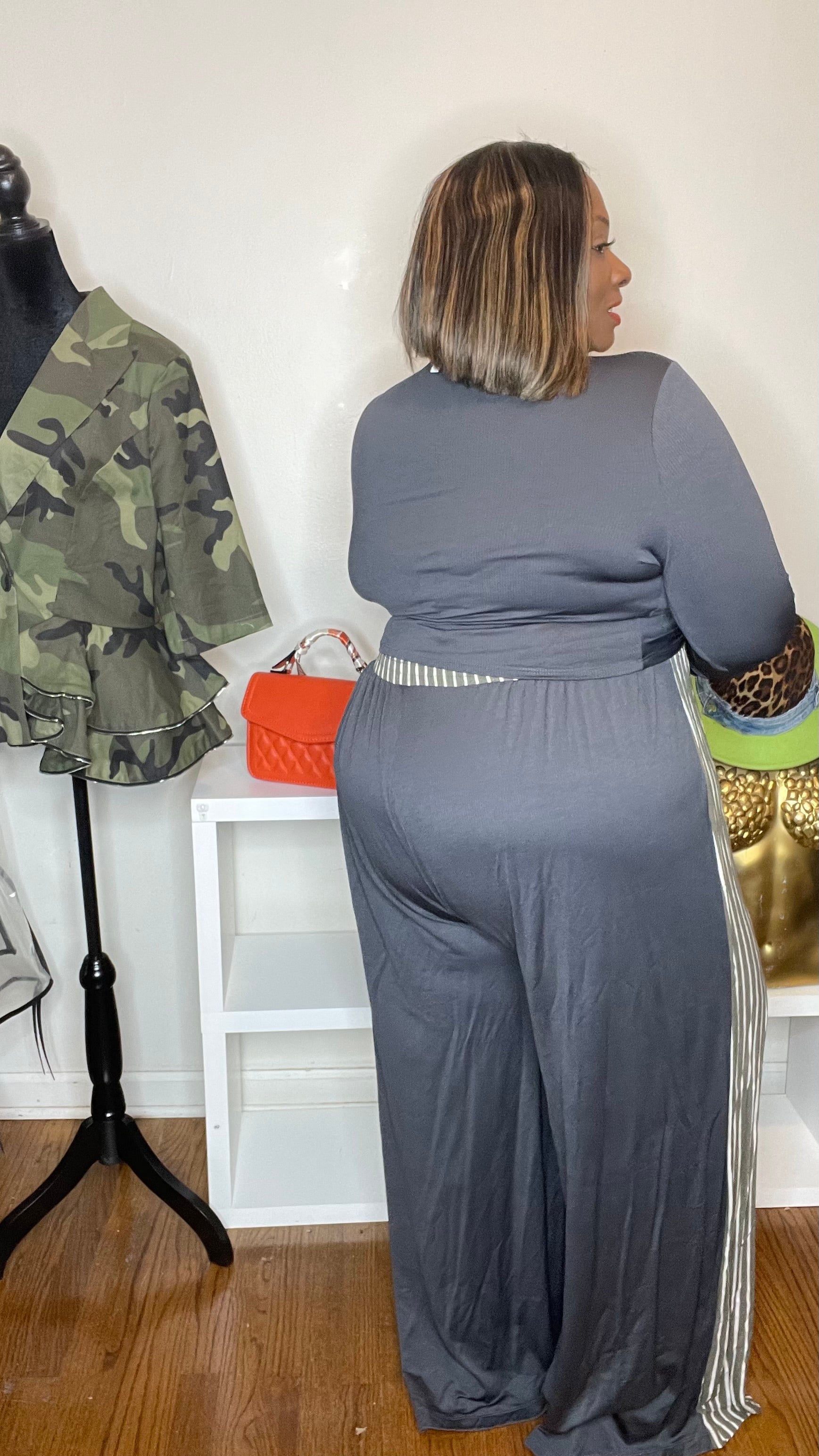 Step into effortless confidence with our Urban Rhythm Twist Set, designed exclusively with curves in mind. This chic two-piece features a sleek, long-sleeve crop top with a flattering front twist that accentuates your shape without sacrificing comfort. Paired with wide-leg, high-waisted striped pants, this set gives you that perfect blend of casual ease and elevated style.